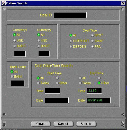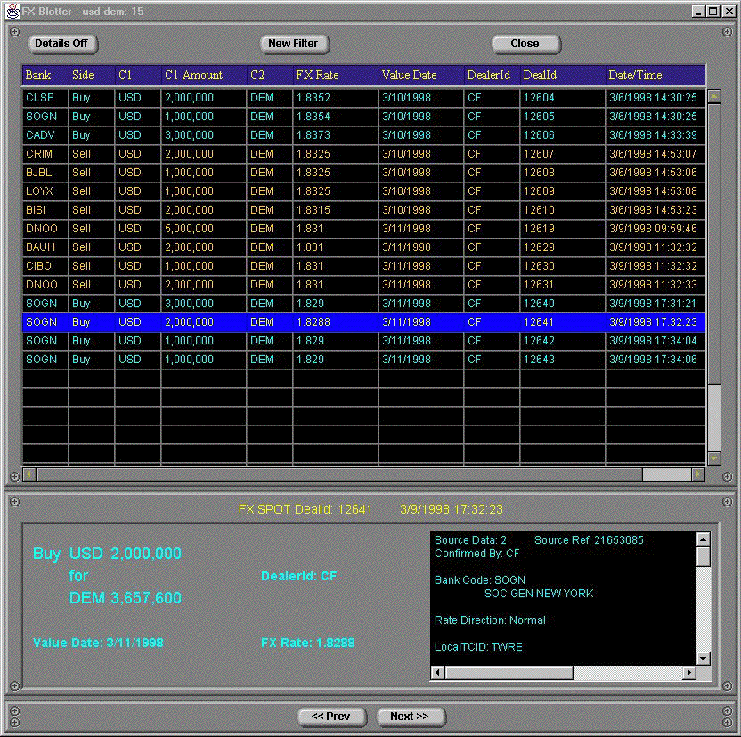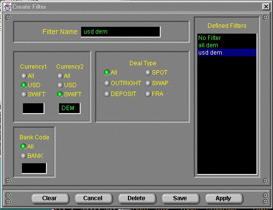Filters are display conditions that are applied to a blotter. Each blotter have have its own filter. Filters may be defined and named for easy recall when necessary. Here is a sample filter selection dialog. This blotter has been filtered to show only USD/DEM deals. Filters only apply to the current day's deals. More filter conditions are being implemented. This dialog box should be regarded as functional but priliminary.