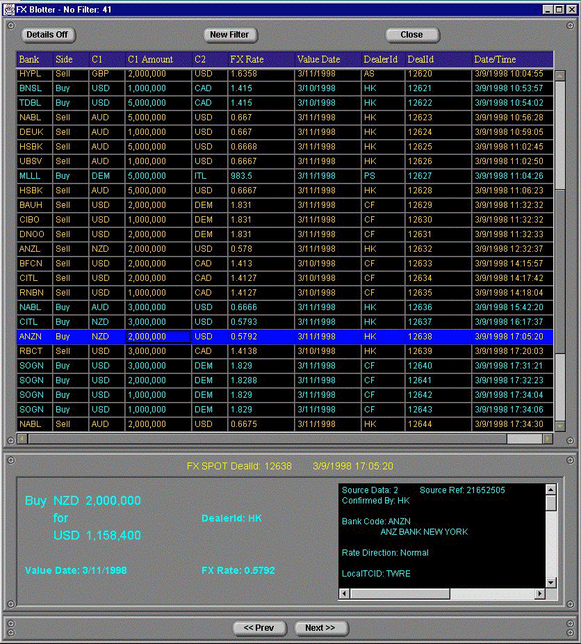 Full details for any deal that is selected in a blotter may be displayed. Details are displayed below the blotter screen. Details may be turned on or off on a per-blotter basis.