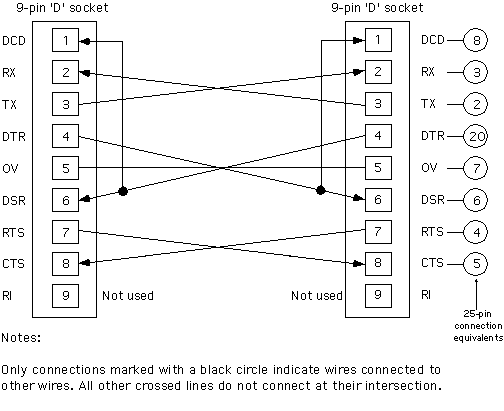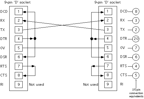 Please note that the diagram below shows a 9-Pin 'D' to 9-Pin 'D' connection (for consistency with the Reuters diagram above). You will need to use the 25-Pin connection equivalents (shown) for, at least, the VAX end of the cable.EBS: Cable Diagram Error