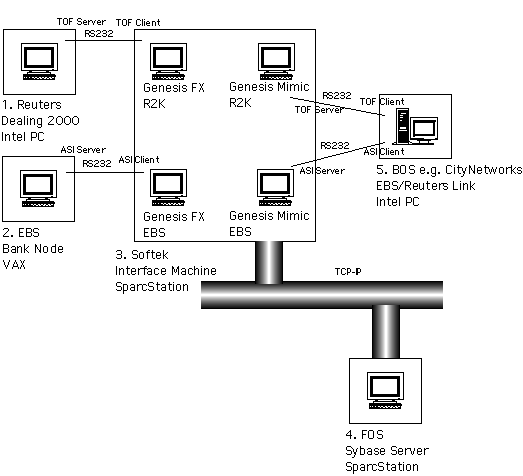 Once a deal packet has been identified and parsed (including its checksum), the data is reformatted and written to the bank's FOS using (e.g for Sybase) a Sybase dblib sqlexec(nsert) call. BOS feeds are accomplished simultaneously using, for example, a Genesis Mimic process, which implements the same TOF and ASI serial line protocols as the original Reuters and EBS servers.
